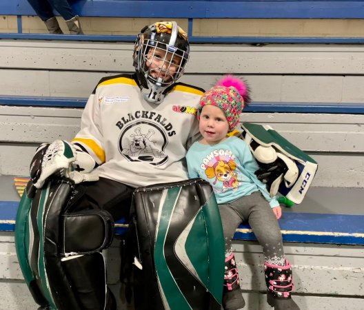 Natasha looks so small next to her brother Gabriel in his goalies'