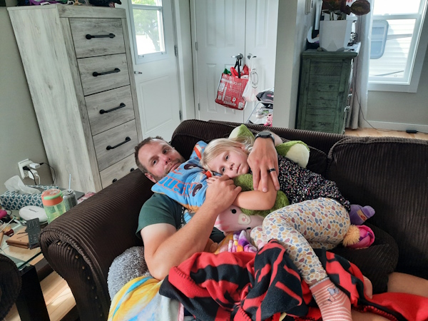 When Natasha got back from daycare, she tried to bury her dad under toys.