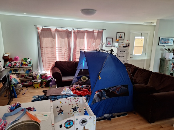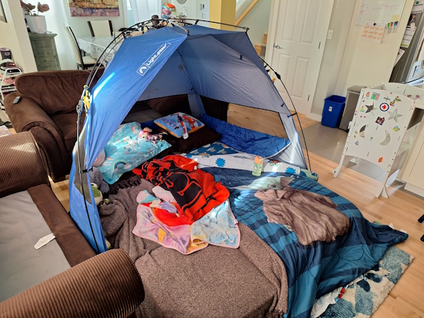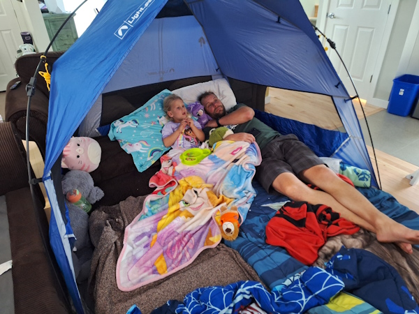 Jeremy is off for the next two days. He and Natasha are having a campout night in the living room.
