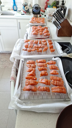 By the time Jeremy gets back from work, it is time to start smoking. We baste the salmon with maple syrup every hour.