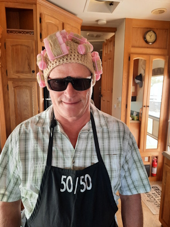 his hat on, we realized he had cut his hat to accommodate his hair.