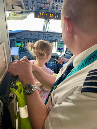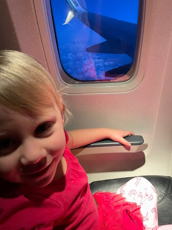 It is Natasha's first-ever airplane ride. She even got to visit the cockpit.