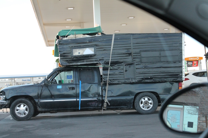 When we got out of the Burger King, we saw this truck and camper... No windshield either.