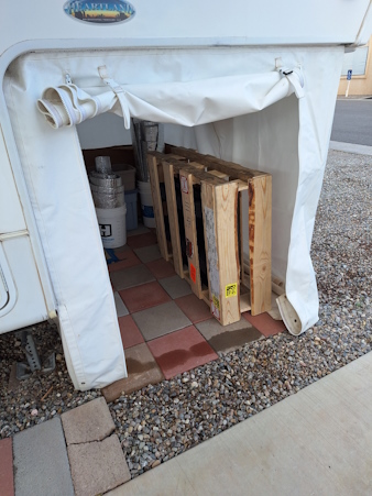 Michele had the idea to paint the plywood before we installed it in the shed. The paint came with the 5th wheel.