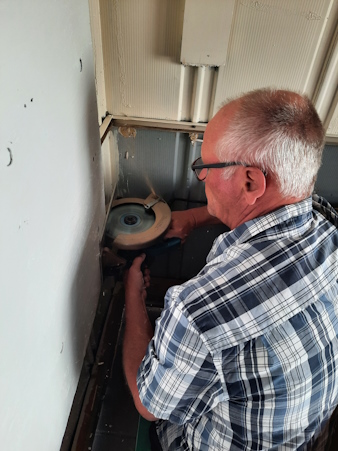 A little miscalculation on my part. I had to cut a small corner of the plywood so the dresser would fit back in its place.