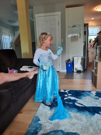 She is watching a movie in our bedroom with grand-maman. Treats are required too.
