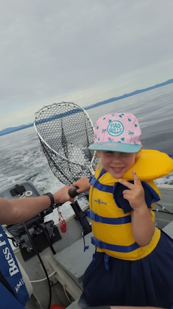 Surprise! She catches a fish before we even got our line in the water. He fish got away just before it got to the boat.