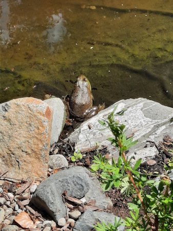 They have a pond with some turtles. The water is not very clear and we cannot see anything.