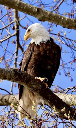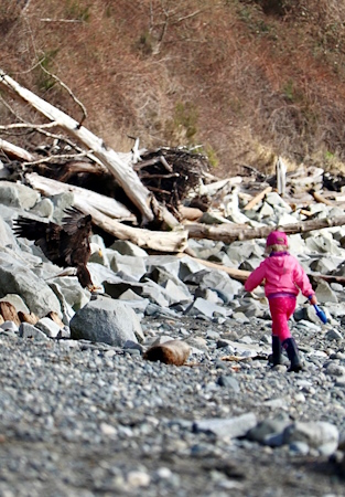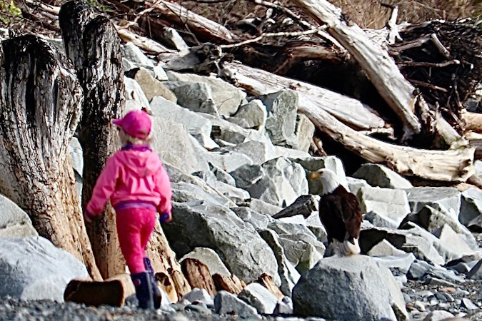 Natasha is on her way to the big rocks. She does not even notice the eagle landing near her.