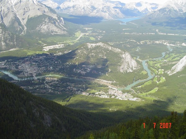 On the top left of the photo, Mount Stoney Squaw at 1,884 meters high.  Middle left, the town of Banff.  The "small" mountain in the middle is Mount Tunnel at only a height of 1,690 m. Top right, you have the Minnewanka lake and going through the photo is the Bow River.