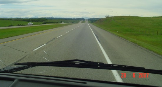 A light drizzle keeps falling until we are out of Calgary, then it stops.  We can see the Rockies looking ahead.