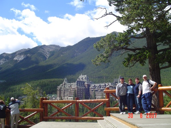 The hotel behind us is the Banff Spring Hotel.  Built in 1886 by the CP (Canadian Pacific), and when it opened in 1888, this was the biggest hotel in the world with 250 rooms.