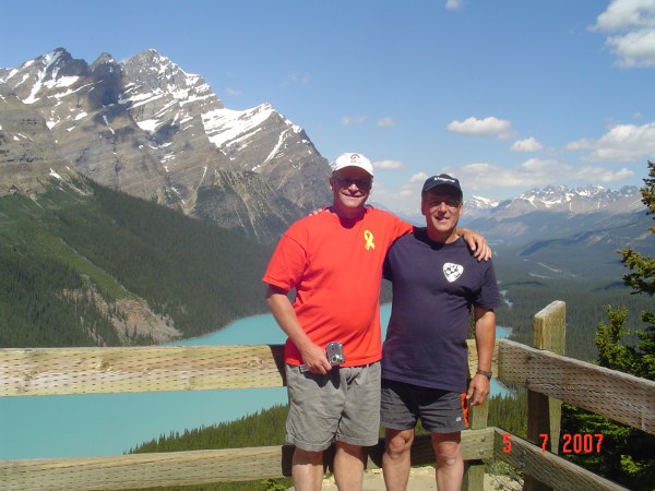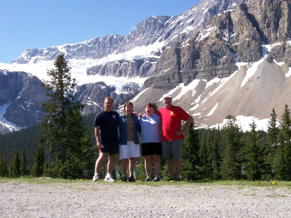 The four of us at Bow Lake with the Crowfoot lake and glacier.