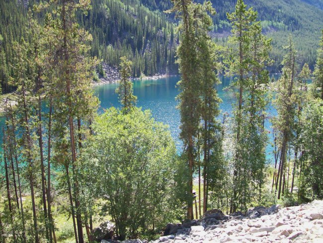 You can see parts of lake Mistaya between the trees.
