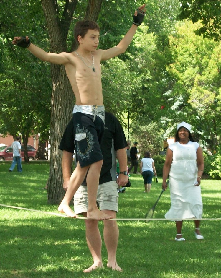 young man just started walking on a cargo strap 5 days ago, he was