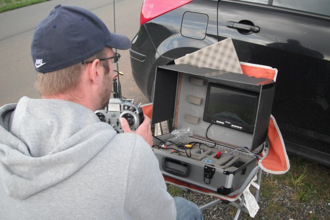 Jérémy is flying his aircraft by looking at the video screen, his