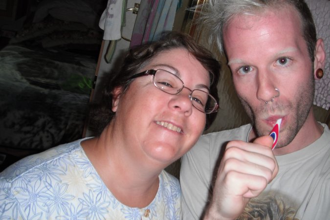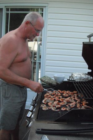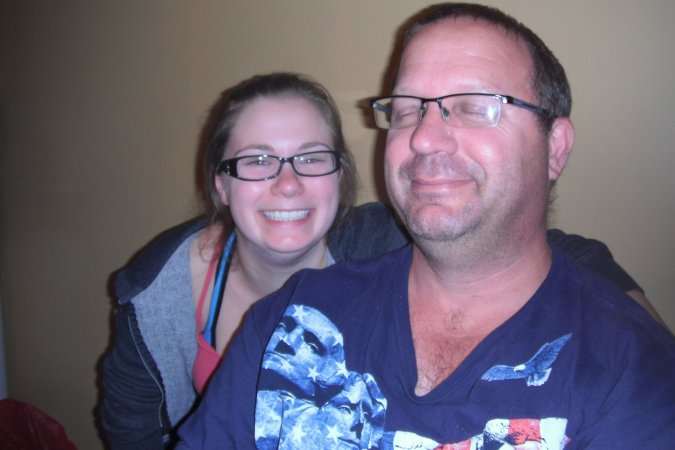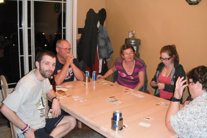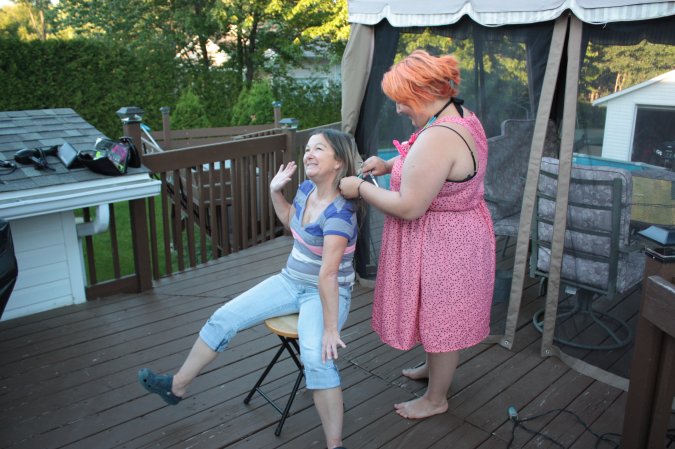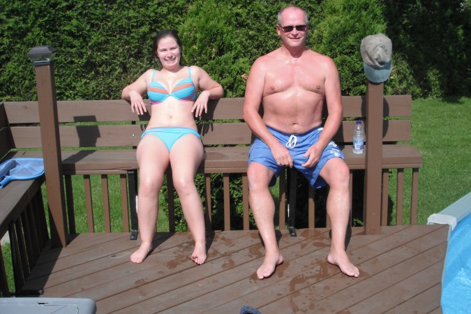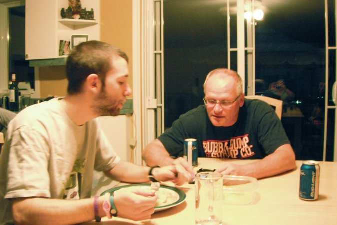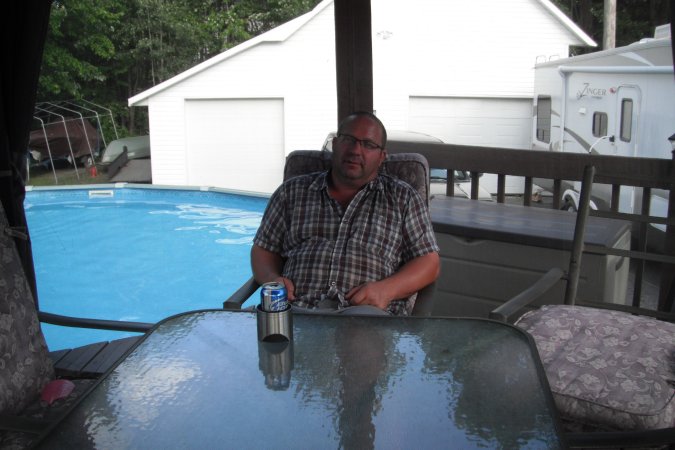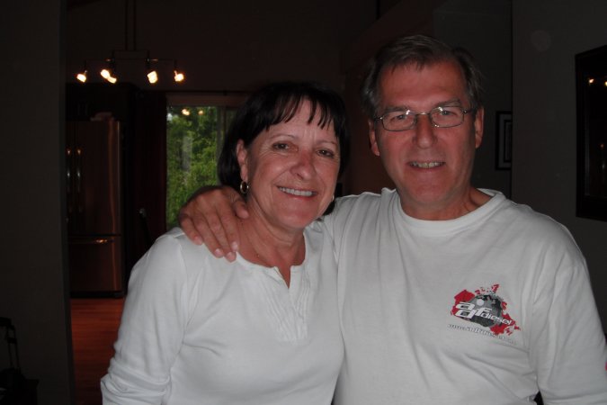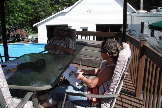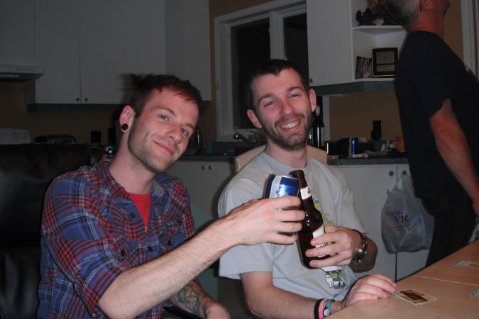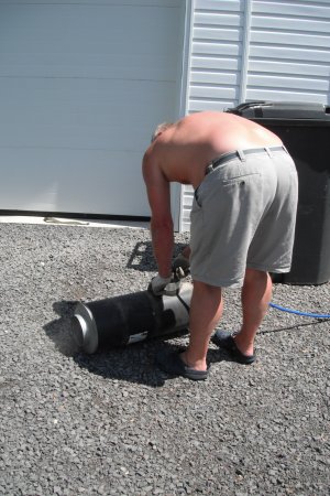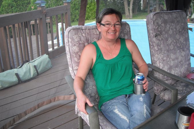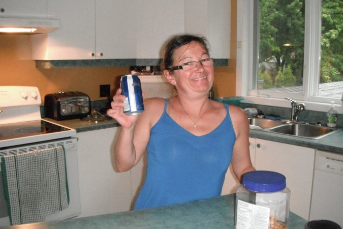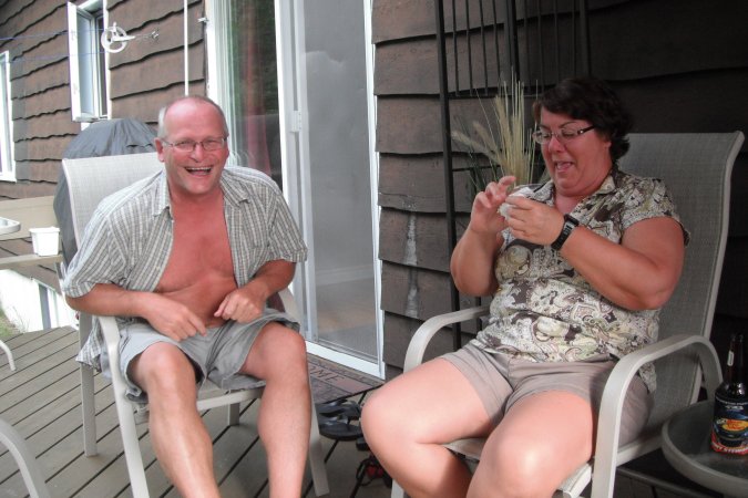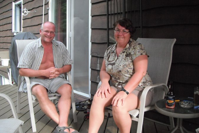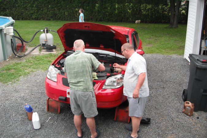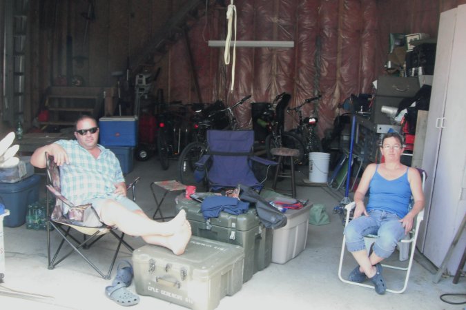 Michèle are enjoying a beer, in the shade, in the garage. LOL!