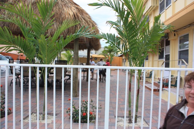 Our friends Daniel and Sylvie on the deck of a hotel talking with