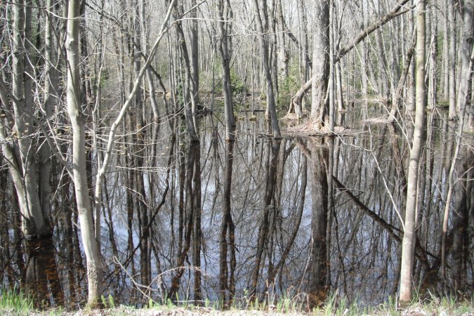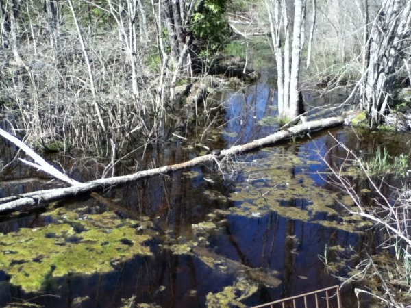 I saw a turtle, he is on the dead tree. I also saw this big frog.