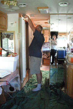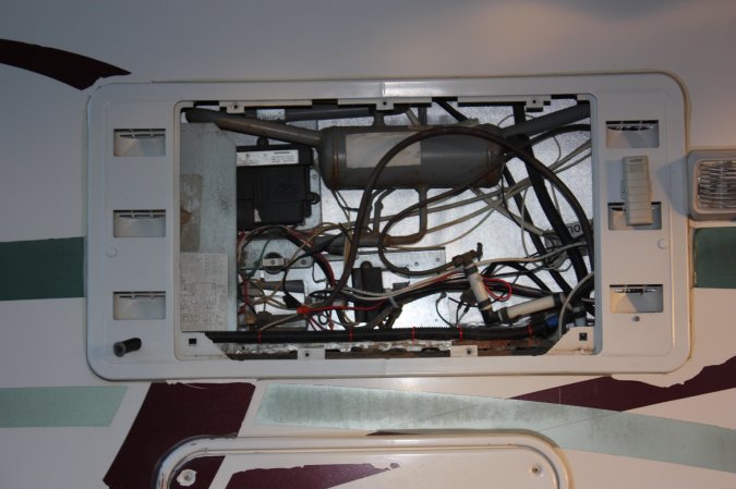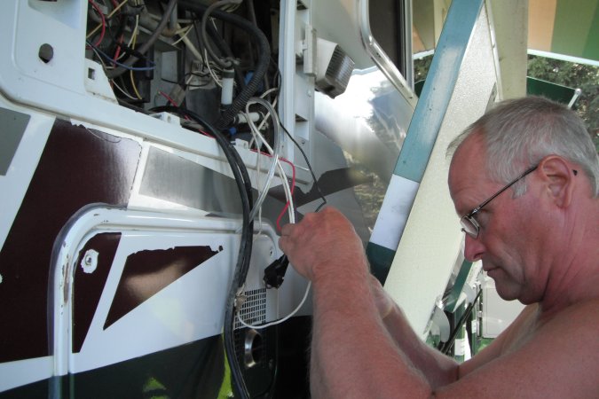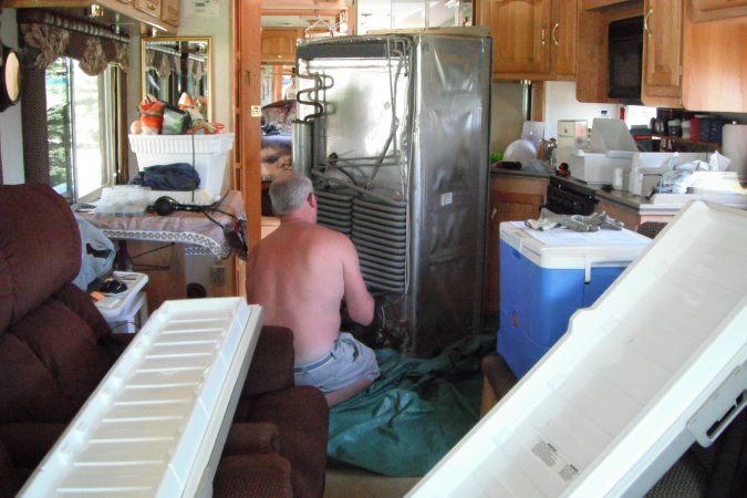 We replace the fridge in the hole, reconnect all the tubes and wires (I