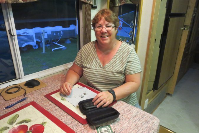 Michele doing the daily "maintenance" on her hearing aids. She is