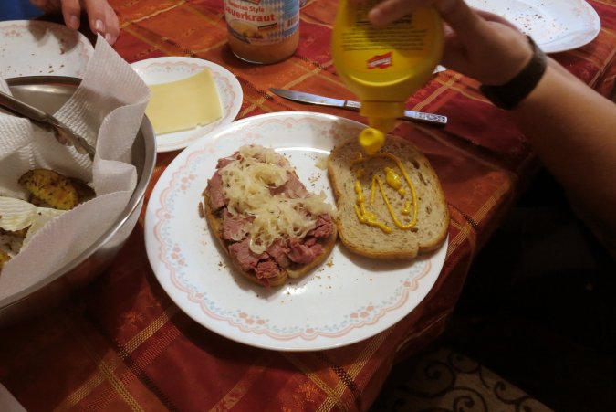 We have Corned Beef Brisket, sauerkraut on Reuben bread with spiced
