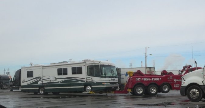 The tow truck showed up by 10 and started to work.