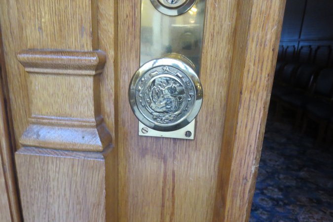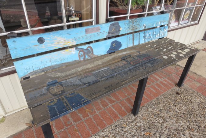 Just a bench with a historical scene.