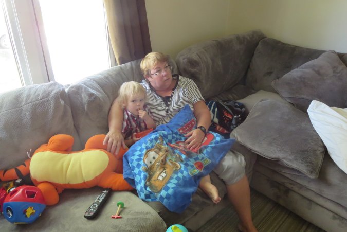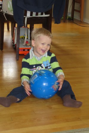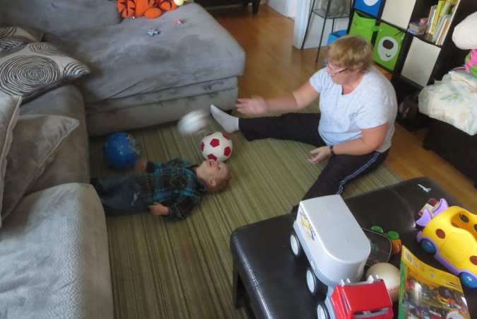Gabriel and Grand-Maman having fun with a ball on the couch. Can
