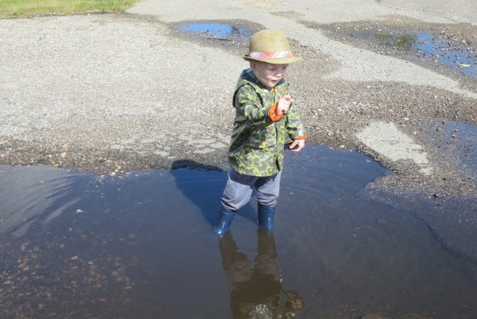 Of course Gabriel fell in the puddles, he is a little cold and wet.