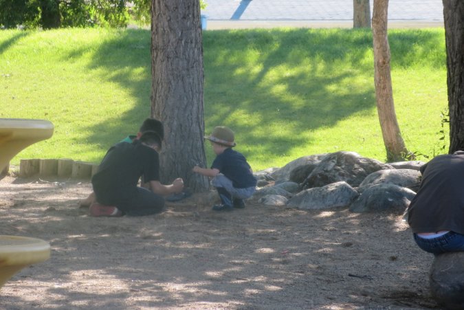 Gabriel watching some older kids playing with worms.