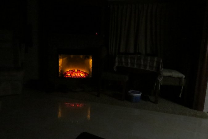 The fireplace is on (no heat) while we read.