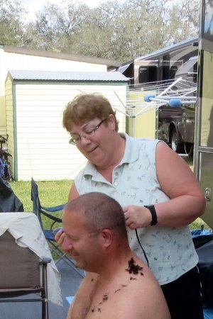 Just before we went to the pool, Michele offered to cut Patrice's hair