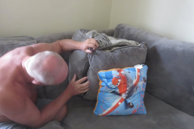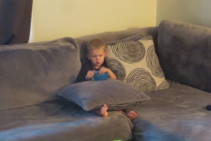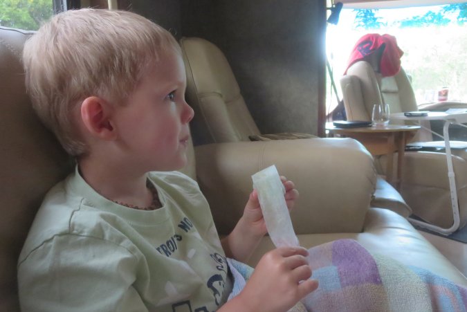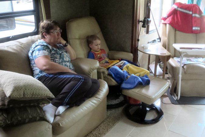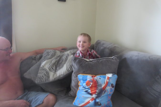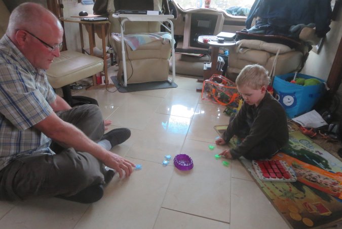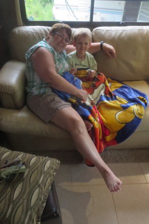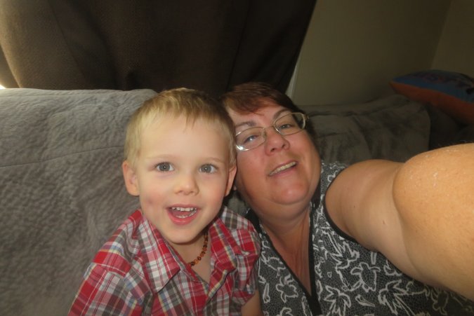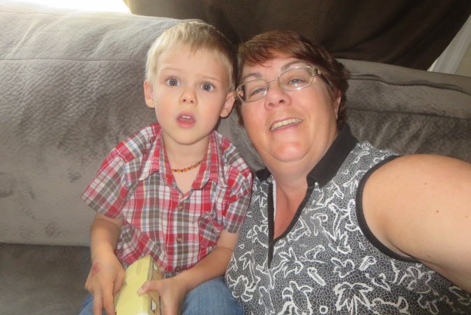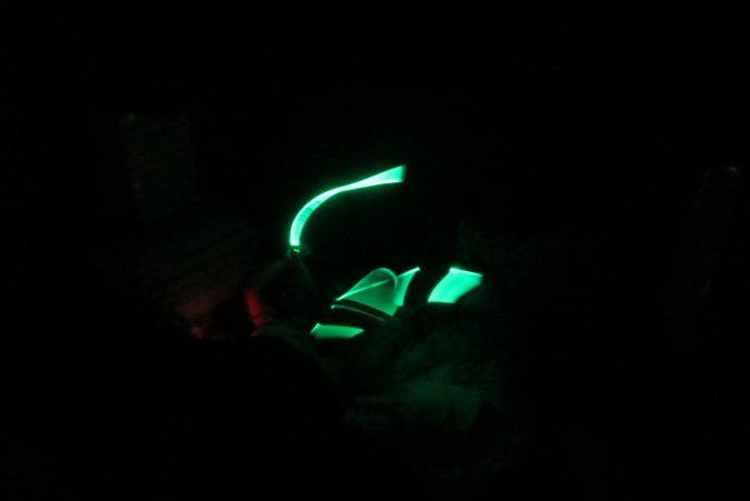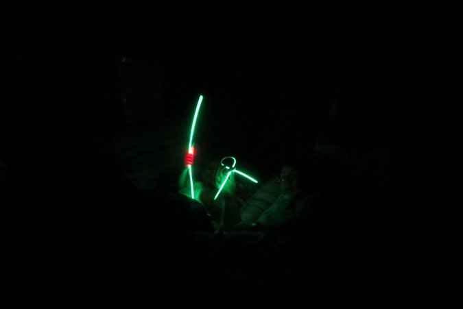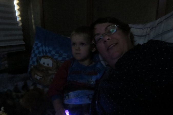Gabriel is in bed with Grand-maman and some "Glow Sticks".
