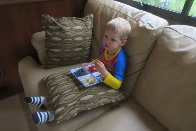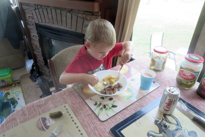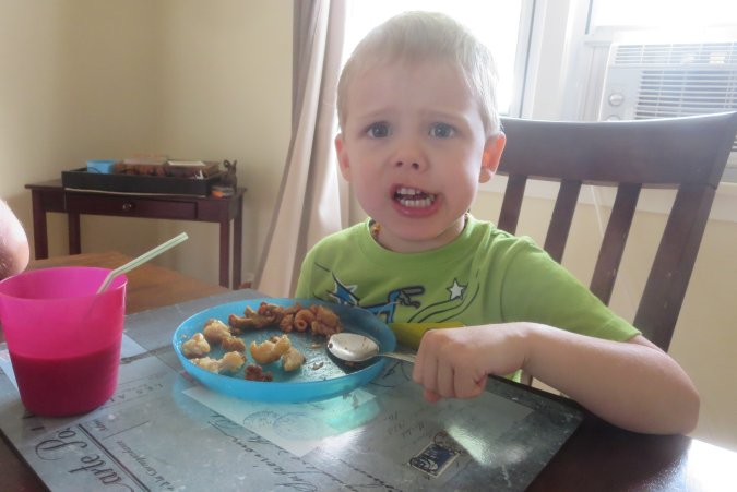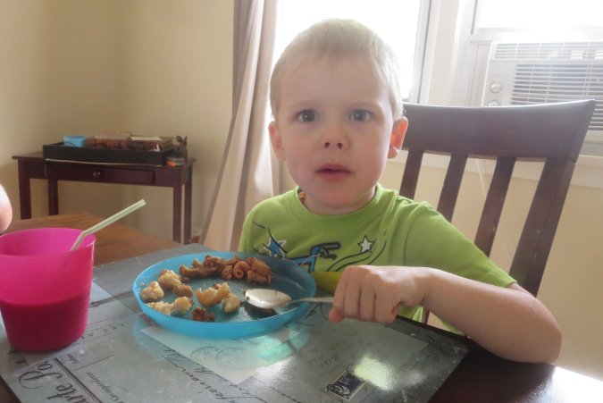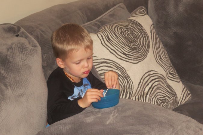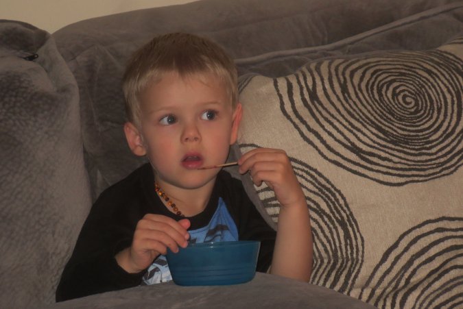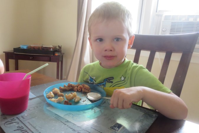 Gabriel is so hungry, he has to use both, a spoon and a fork!