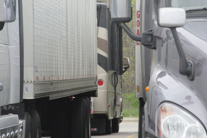 The right lane is closed for repairs and on our way across, a transport