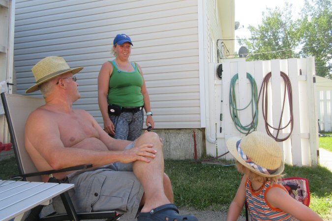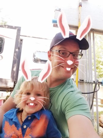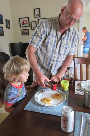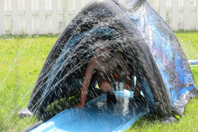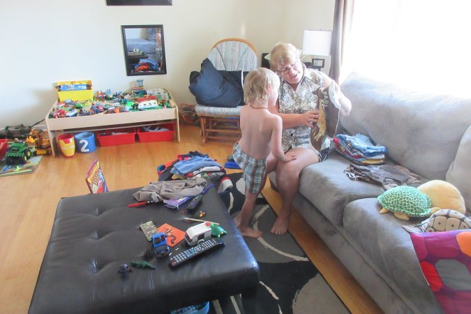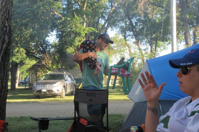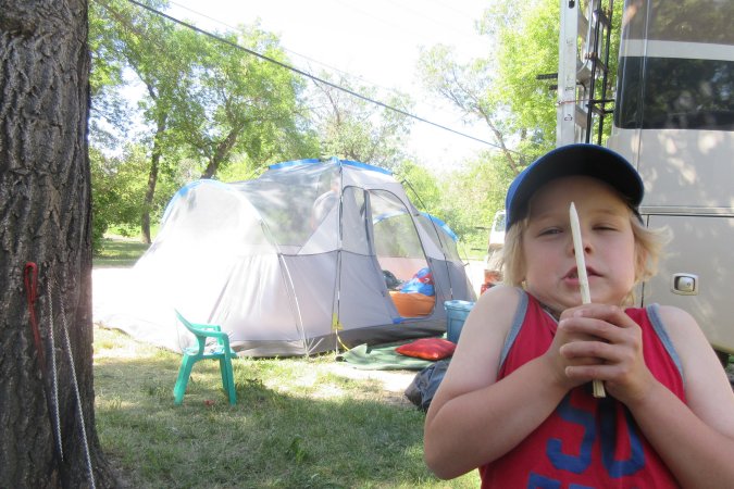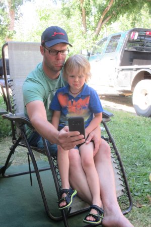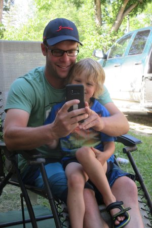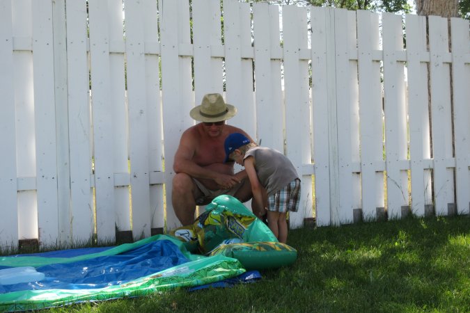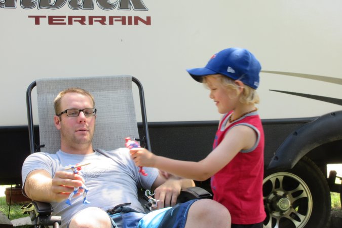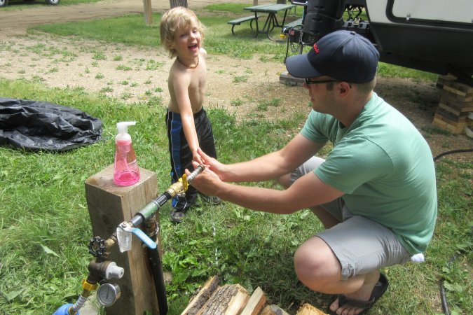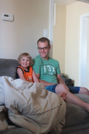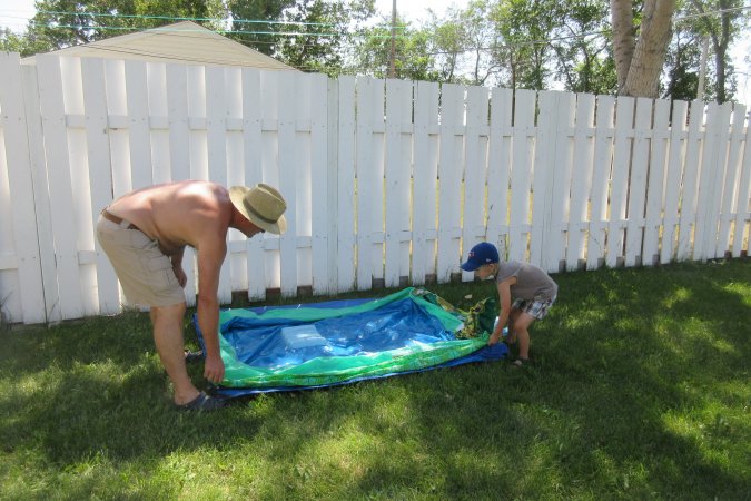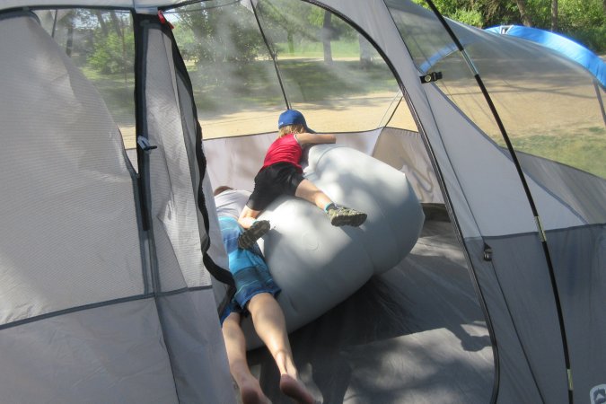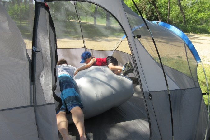 Gabriel helping Dad deflating the air mattress and packing up the tent.