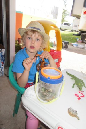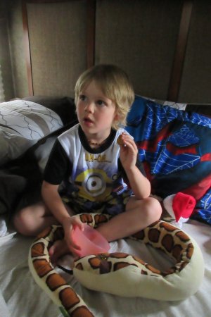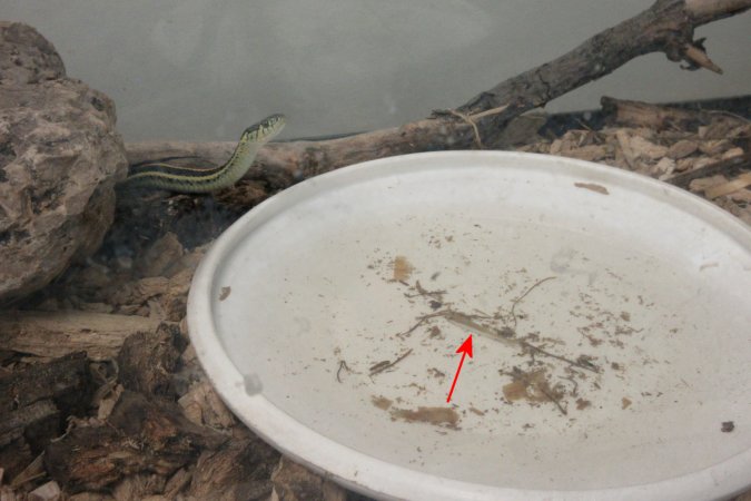 The exhibit includes a small "cage" with a snake and a fish for snack.
