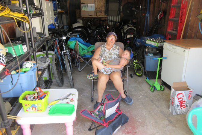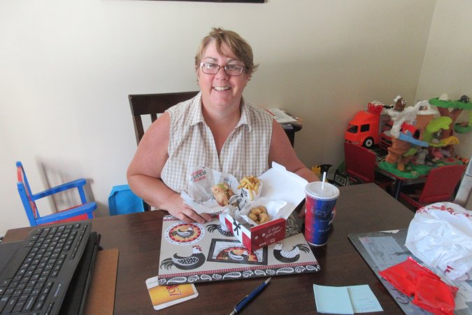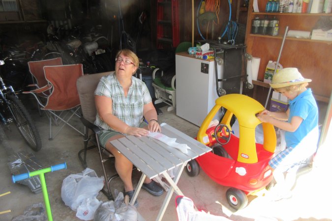 Michele is folding plastic bags for Jeremy. This way it takes a