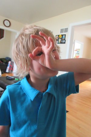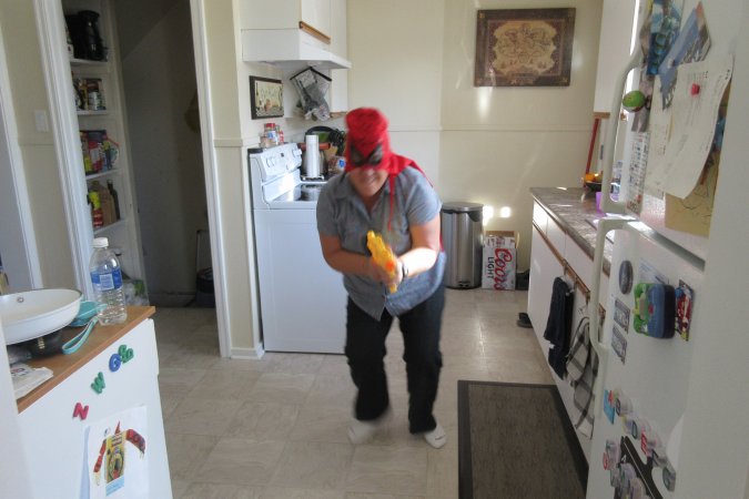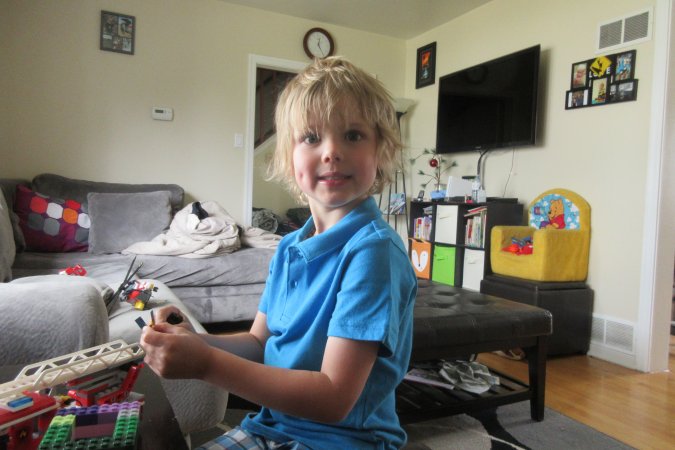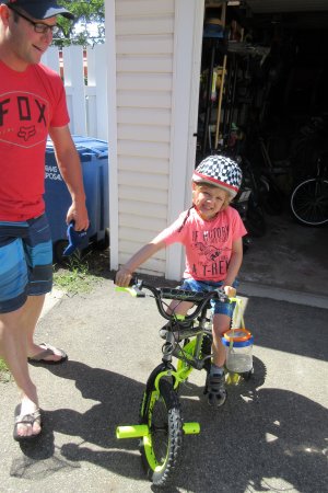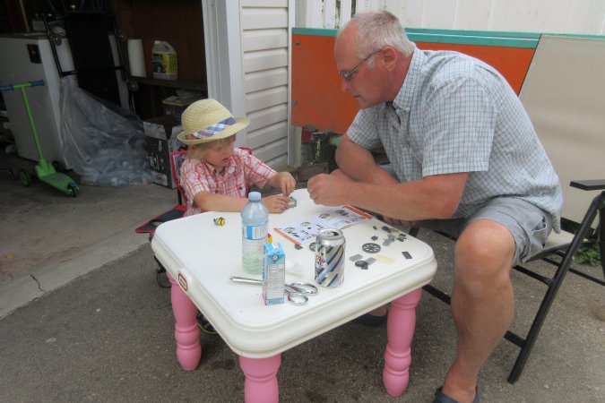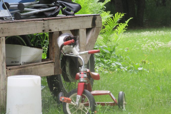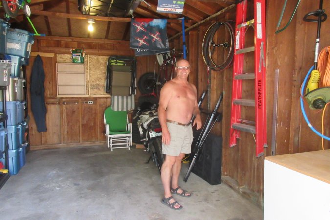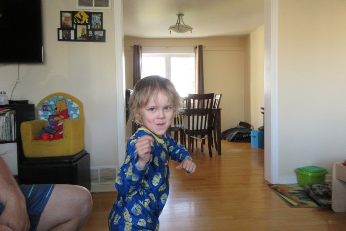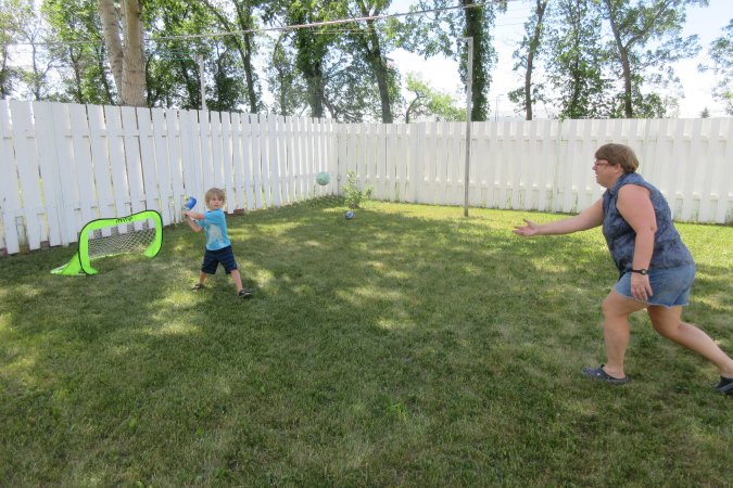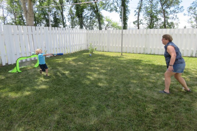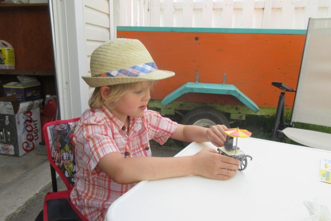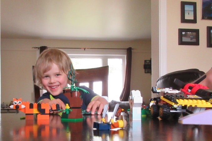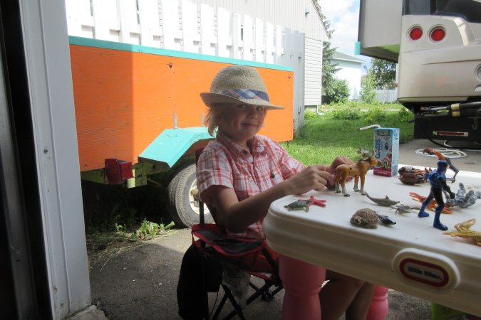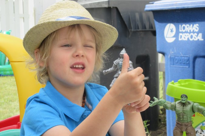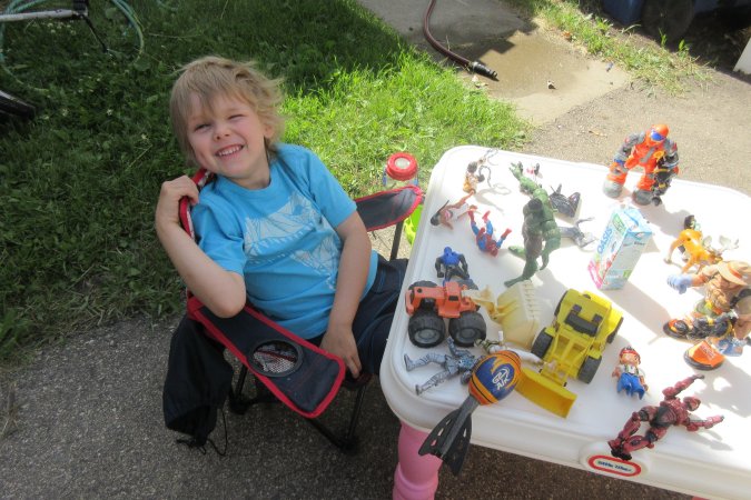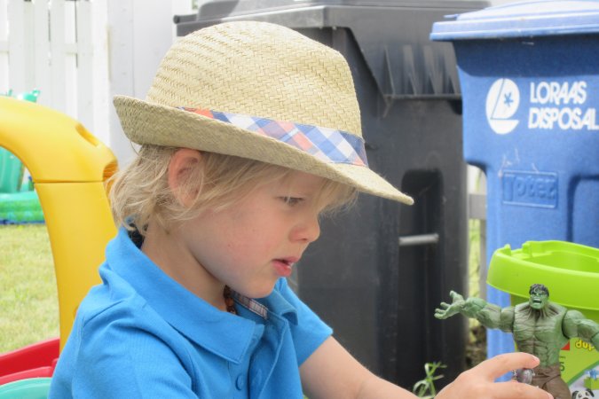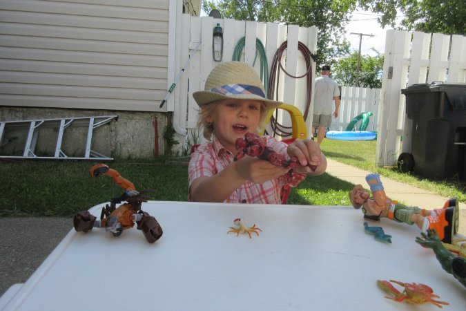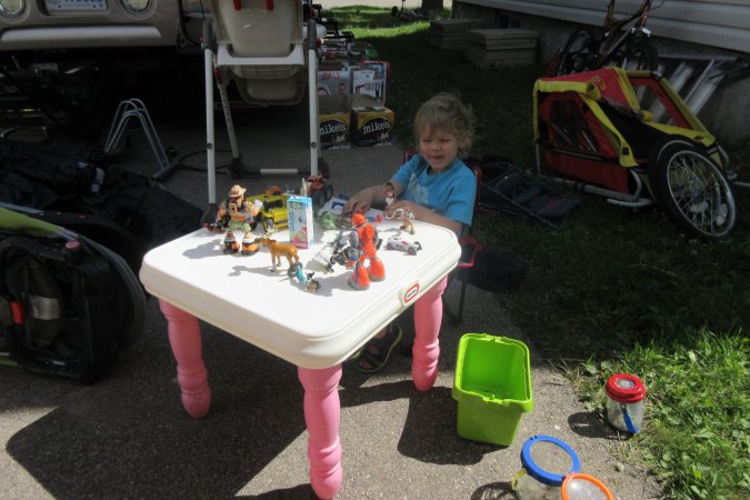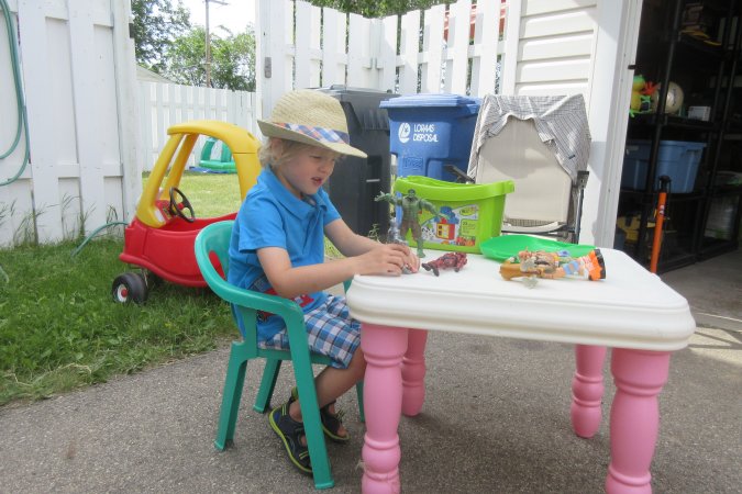 While I am cleaning up the garage, Gabriel plays with his toys.