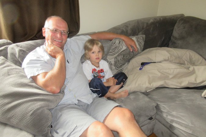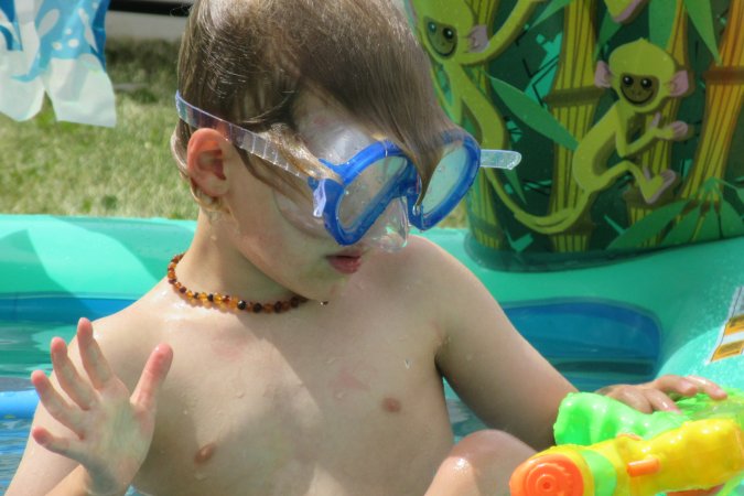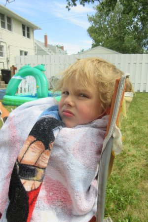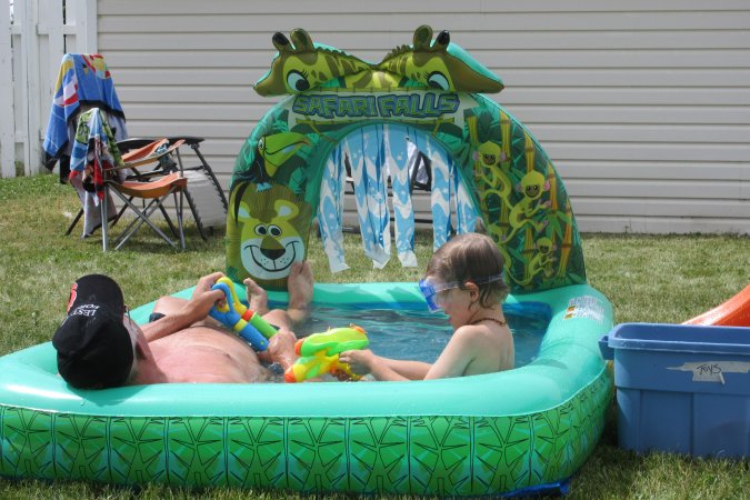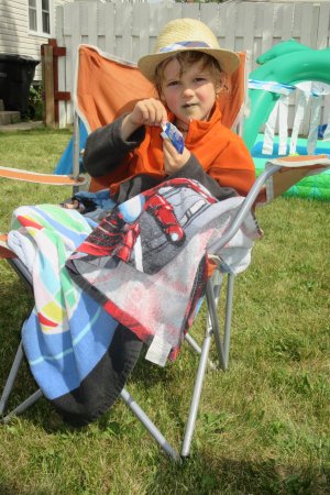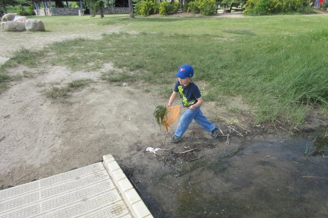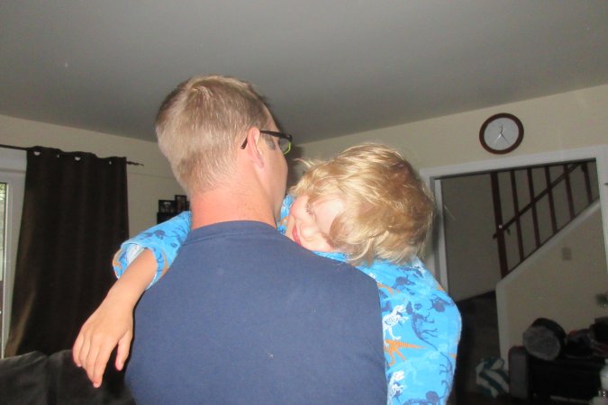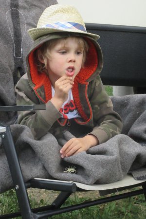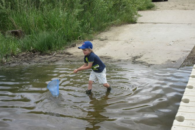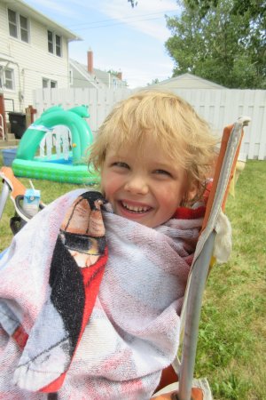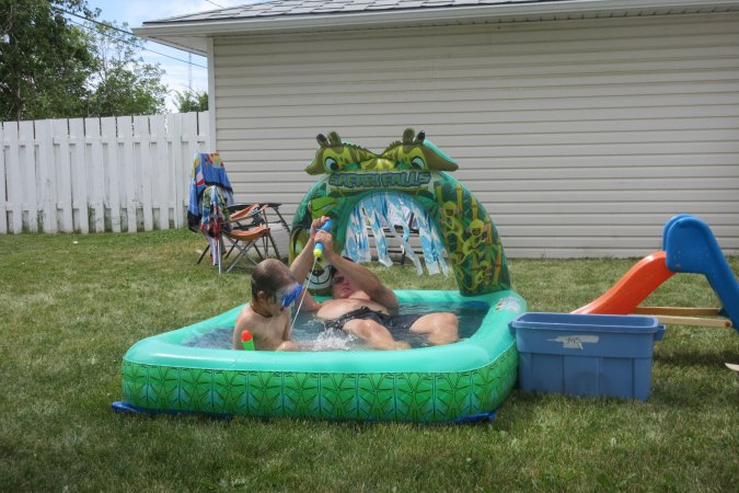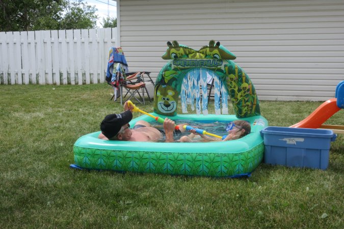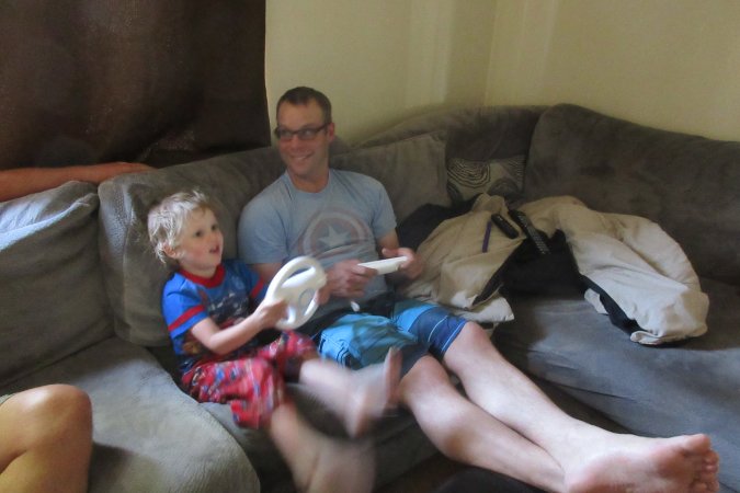 Gabriel managed to fall down with his fish and got his dad all wet with