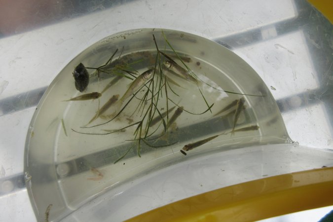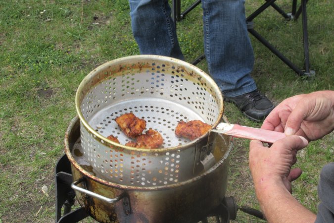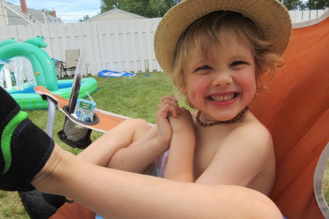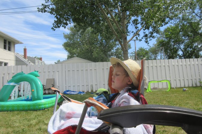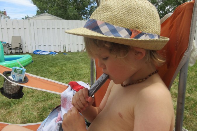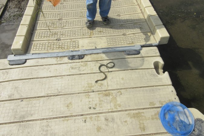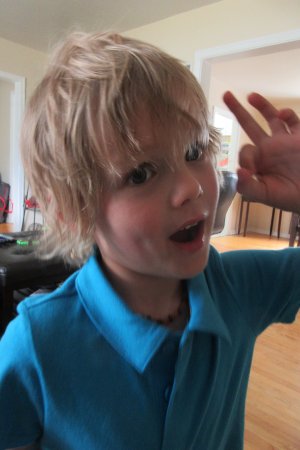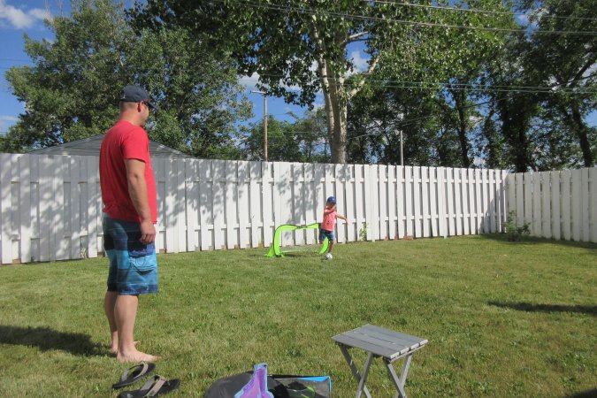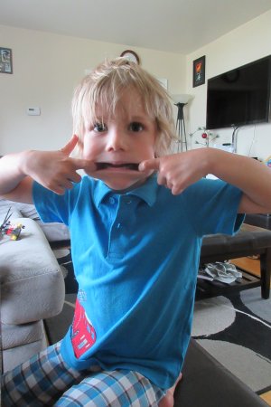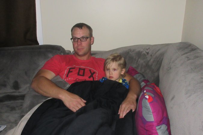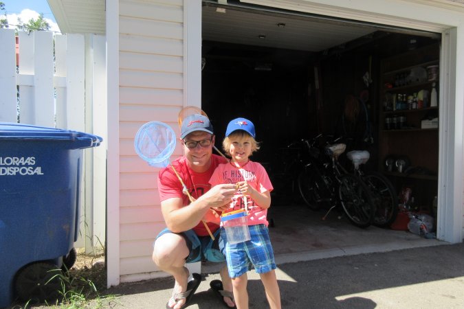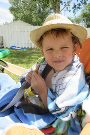 Gabriel managed to fall down with his fish and got his dad all wet with