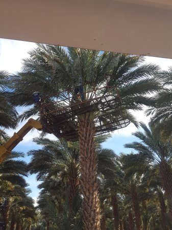 they get to the top of the palm tree to do some stuff to the palm tree.