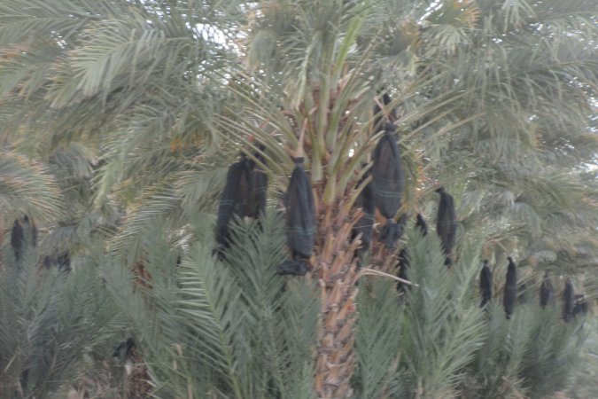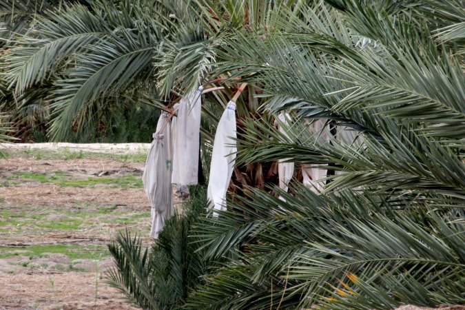 Before they can harvest the dates, they place a white cotton bag over the pod of baby dates to protect them from birds.