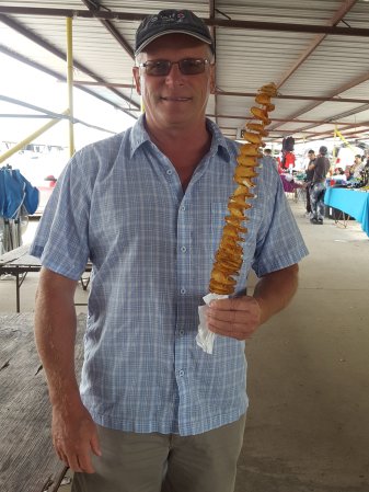 It is a potato cut in a spiral and deep fried. You can add ketchup to hot sauce, whatever you like. It is OK.