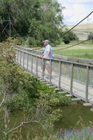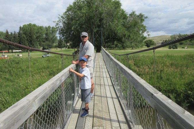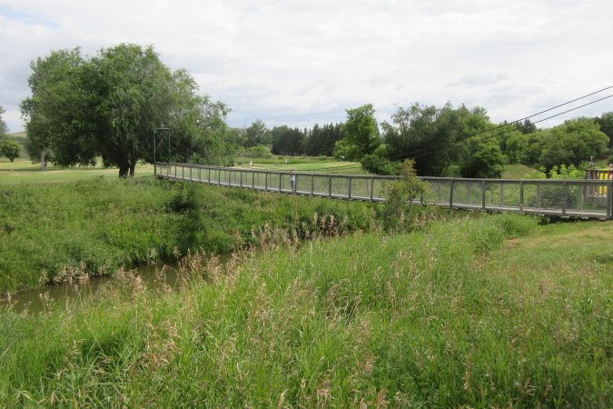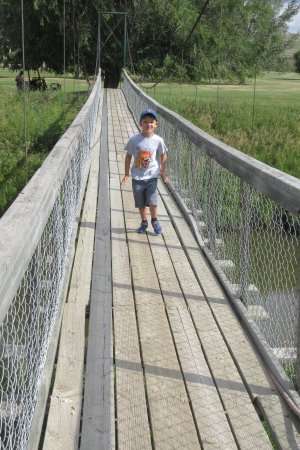 There is a small suspension bridge over the river, it belongs to the local golf club.