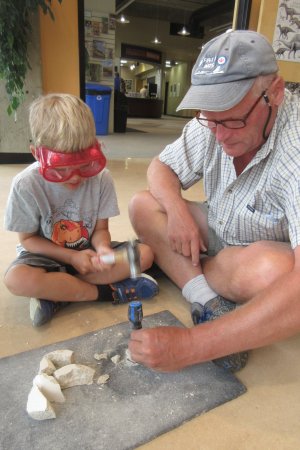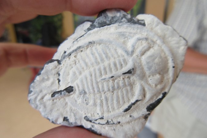 is hitting the rock pretty hard and he found the fossil of a trilobite.