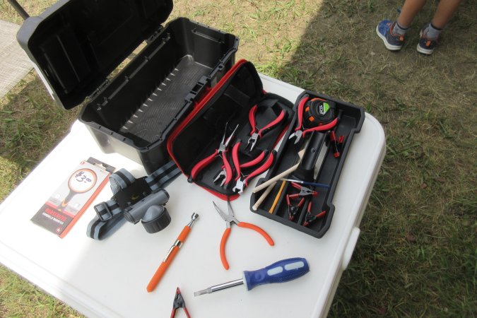 Gabriel starts with the tools supplied with the kit, but ends up using a real hammer.