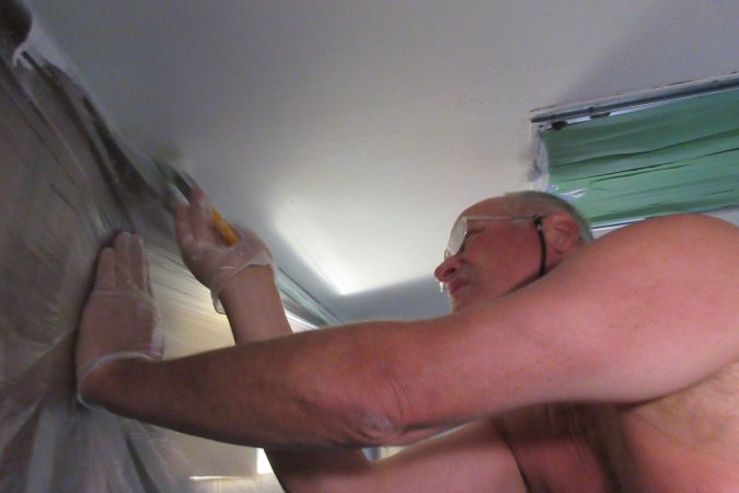 First we put some plastic sheeting with tape on all the walls to protect them from the dust.