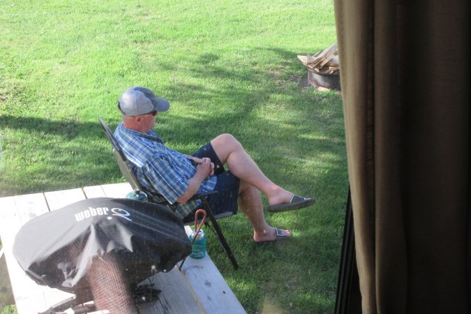A little before lunch, I am cooking my next batch of breakfast sausages, in the shad with my sunglasses on.